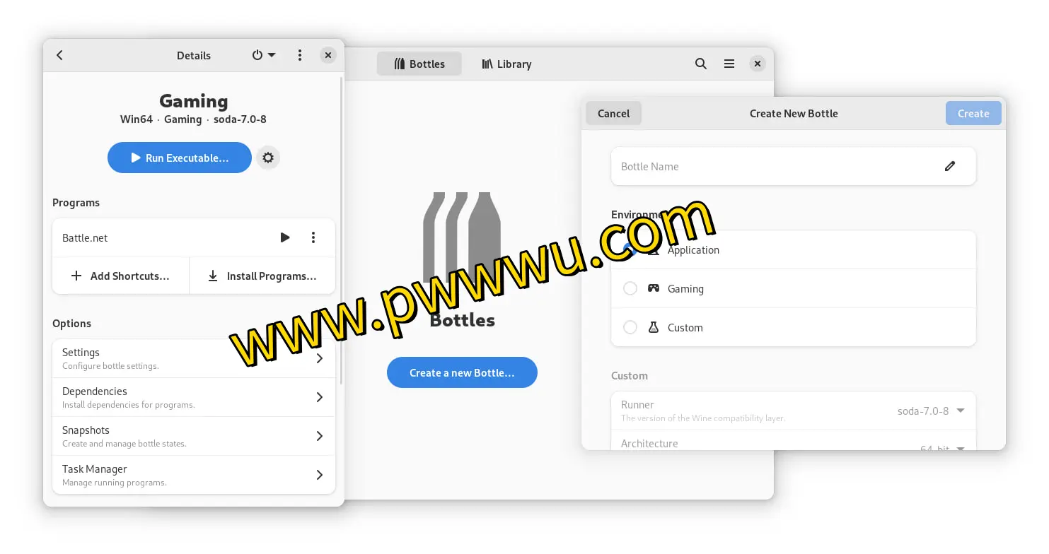 这款名为Bottles的应用程序,主要功能是让Linux操作系统能够兼容运行各类Windows软件。它特别针对游戏运行环境进行了深度优化,通过预设配置使得大量Windows平台游戏能在Linux系统中流畅运行。