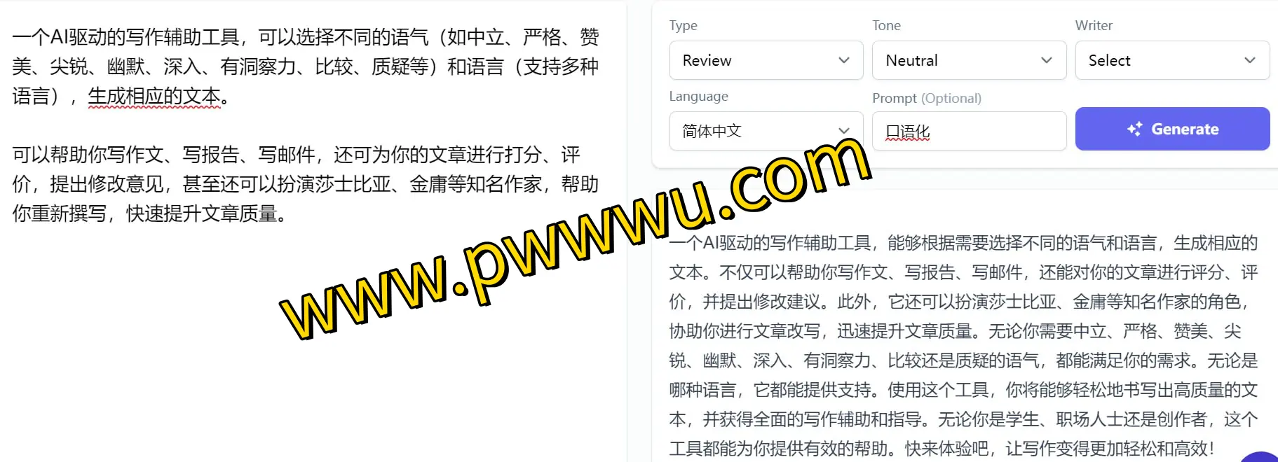 该平台运用智能技术辅助文本创作,提供多样化的语气选项,例如客观、严谨、赞赏、犀利、风趣、详尽、富有见地、对比分析及批判性质疑等,同时兼容多国语言环境,能够根据需求生成对应的文字内容。