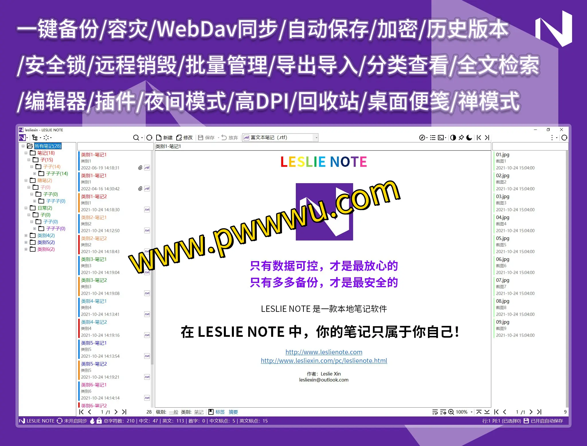 LESLIE NOTE是一款专注于本地化管理的笔记应用,其设计理念着重于用户对数据的完全掌控、安全防护与跨平台通用性。