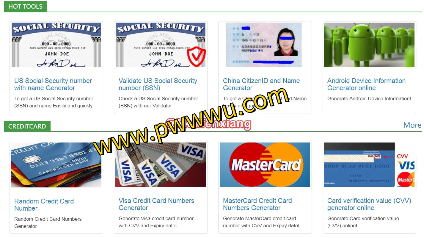 - 提供各国信用卡号、社会安全码等金融相关虚拟凭证
