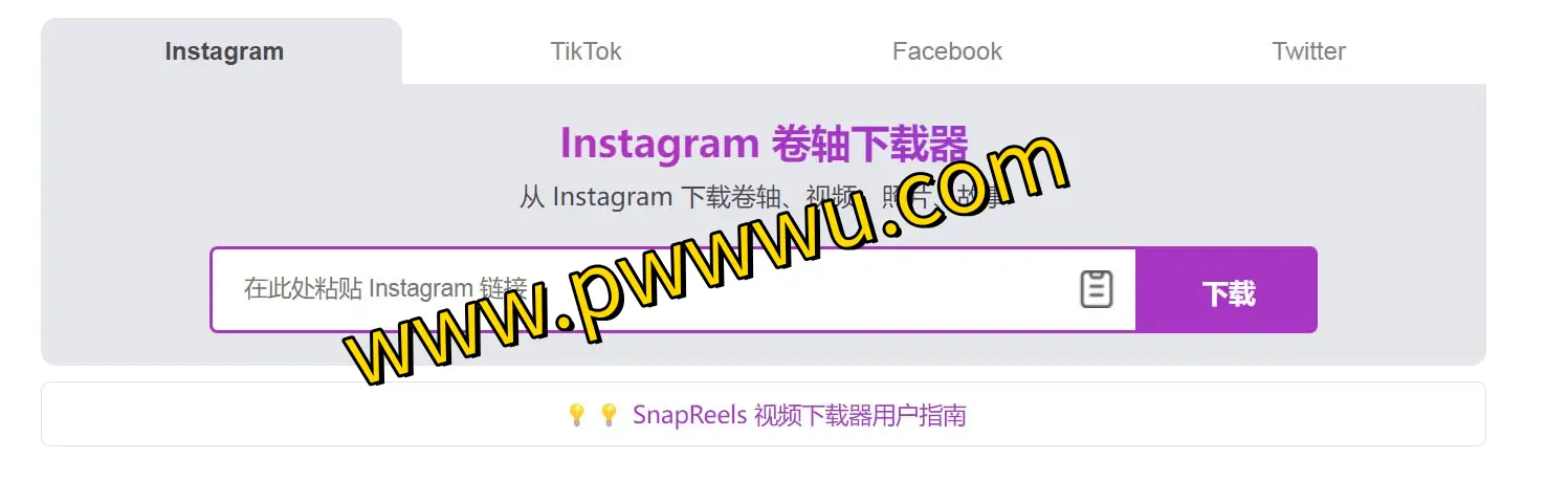SnapReels是一款专注于视频内容下载的在线工具,支持从多个主流社交平台获取视频资源。该工具能够帮助用户保存Tiktok、Instagram、Facebook等平台的视频内容,并提供多种分辨率选择。