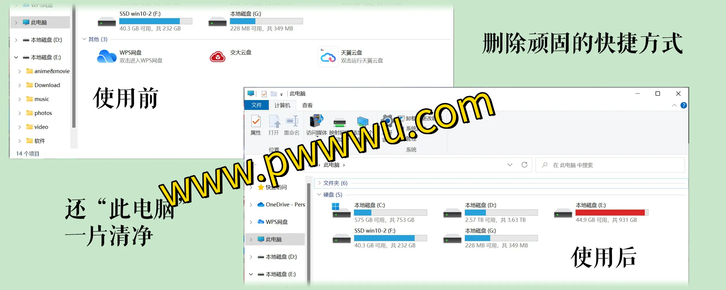 本工具专注于管理“此电脑”界面中难以清除的冗余快捷方式,涵盖主界面及侧边栏区域。除了能够彻底移除各类软件自动生成的顽固快捷方式外,还支持用户自主添加个性化快捷入口。