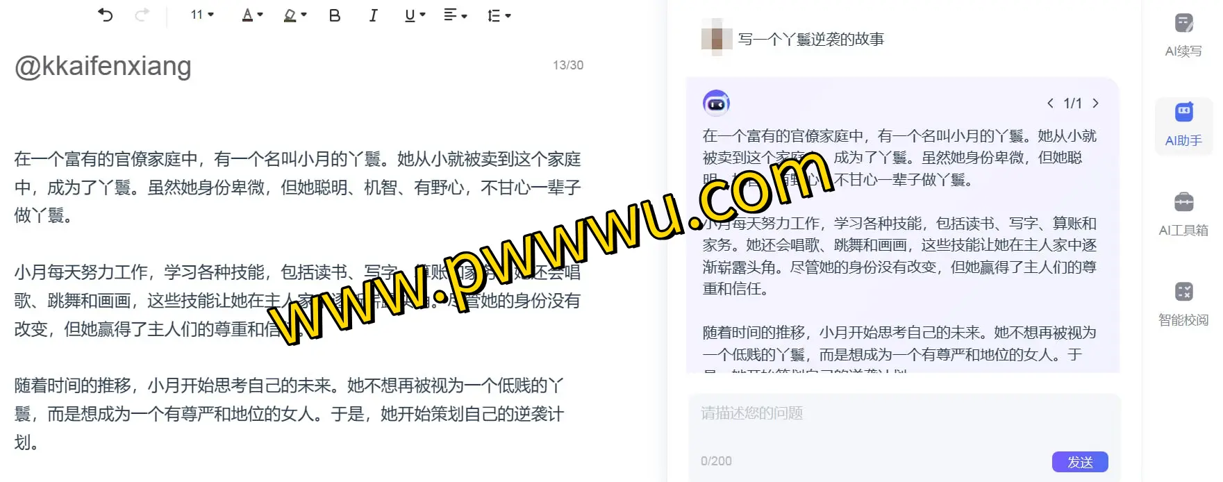 - 智能对话助手:通过自然语言交流解决创作难题,涵盖文笔修饰、情节设计、知识查询等维度
