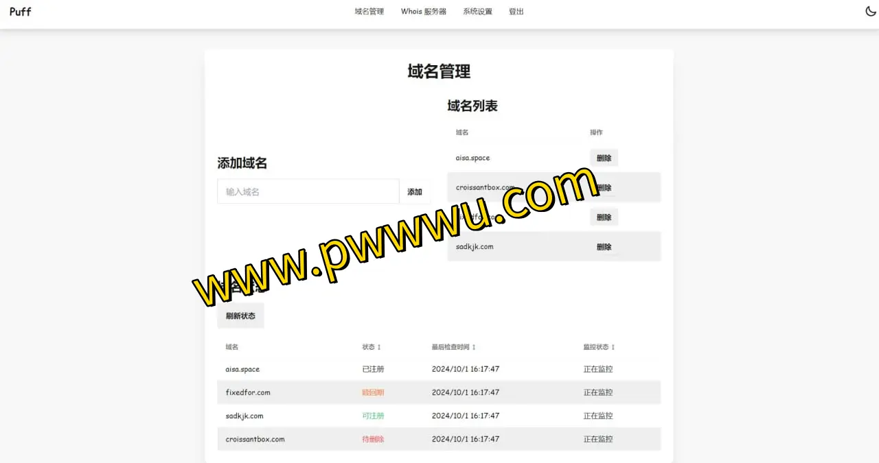 Puff是一款专注于域名状态监测的开源应用程序。该工具通过实时查询Whois信息,能够准确追踪域名的生命周期状态变化,包括赎回期限、可注册状态以及待删除提醒等重要节点。