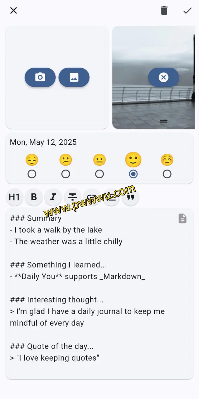 通过这款软件,你可以方便地书写每日日志、追踪情绪变化、插入照片并进行多样化的笔记排版。所有记录内容均存储于用户本地设备,充分保障个人隐私与数据自主权。