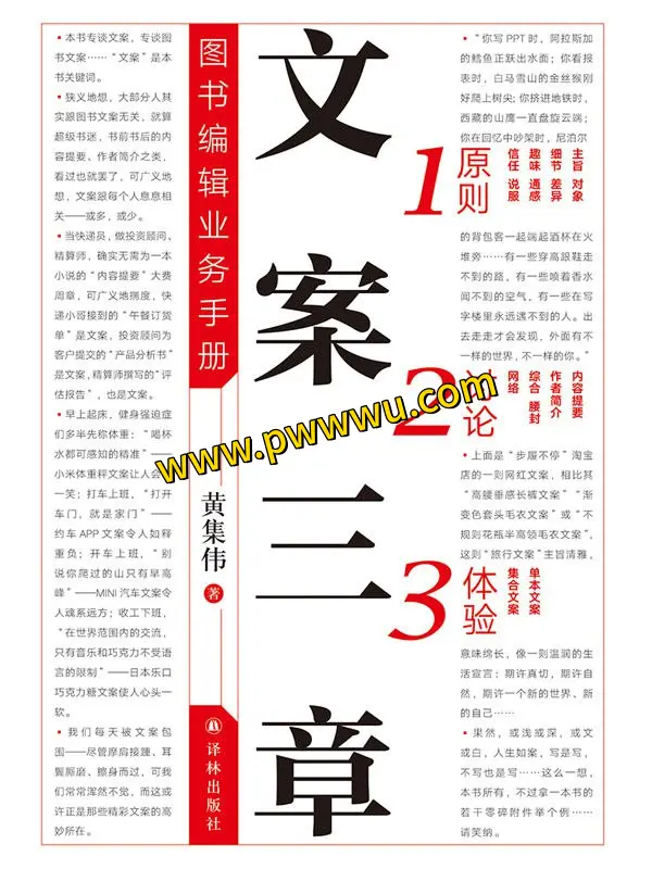 本书由作家兼资深出版人黄集伟精心撰写,深入探讨了图书文案的编写技巧。在出版业不断进步的今天,图书文案的作用愈发显著,文案能力已成为图书编辑的核心素质。黄集伟先生凭借丰富的出版和媒体经验,汇集众多案例,细致阐述了图书文案的创作经验。《文案三章:图书编辑业务手册》分为三大板块:原则篇、讨论篇和体验篇,旨在为出版界人士及广大文字工作者提供实用的参考。