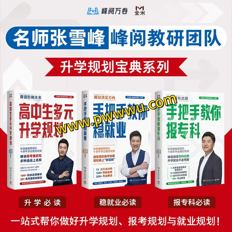本套书籍包含《高中生多元升学规划》、《手把手教你报专科》和《手把手教你稳就业》三册。《高中生多元升学规划》专注于消除多元升学的信息障碍,透过复杂升学体系,为父母和学生指明清晰的升学路线。本书从专业分析、报名流程、职业规划、专业匹配、特色院校介绍、薪资水平等多个维度入手,通过实际案例和详细数据,助力家长与学生清晰地选择最适宜的升学路径,为孩子的未来开启更多可能。