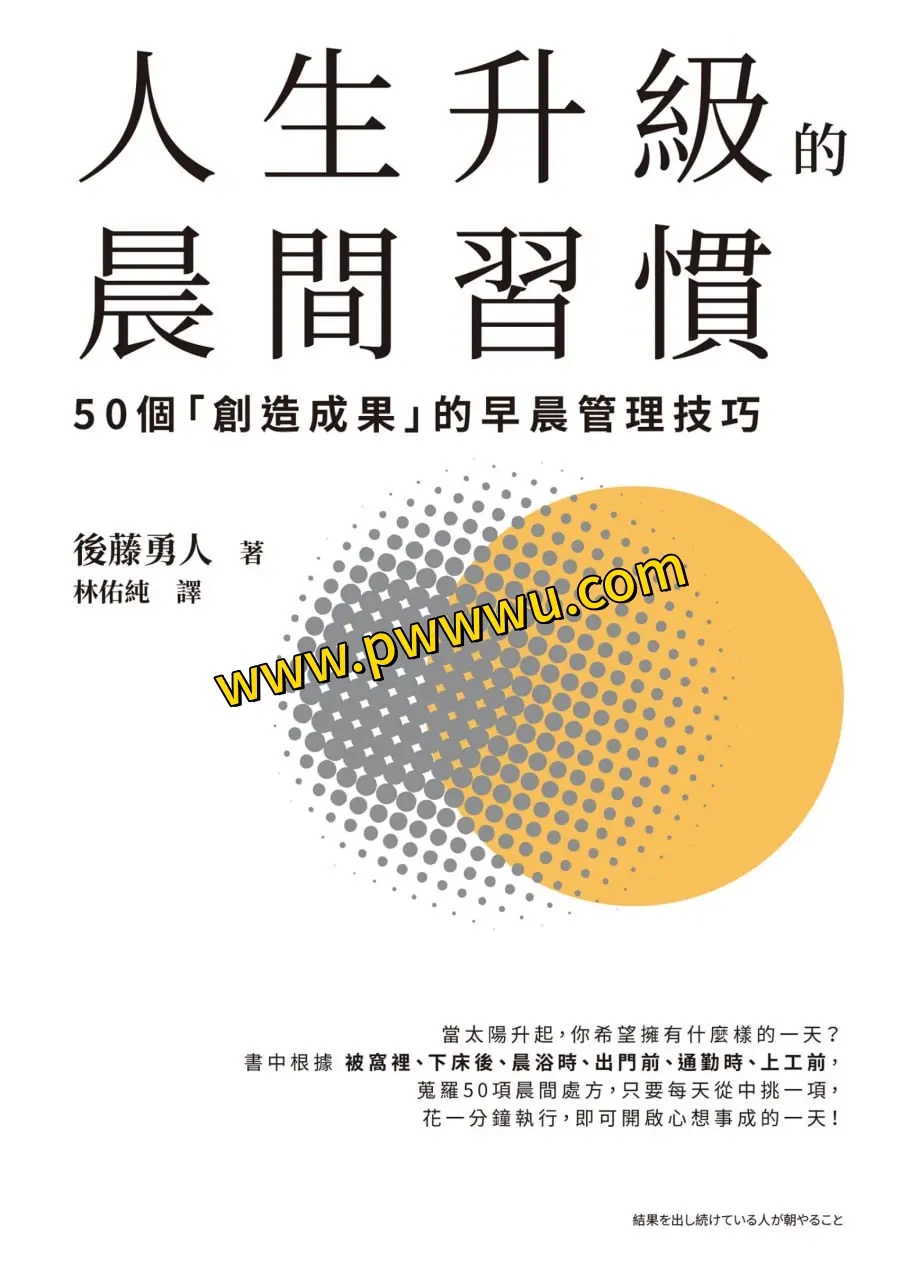 一流的早晨与众不同,成功人士的早晨活动有助于培养积极情绪、优秀成绩和高效团队。逆境可以转化为助力,创造持续的成功。本书提供了50个早晨活动建议,涵盖从床上醒来到开始工作前的各个阶段,每个活动只需一分钟,帮助你开启一个心想事成的日子。