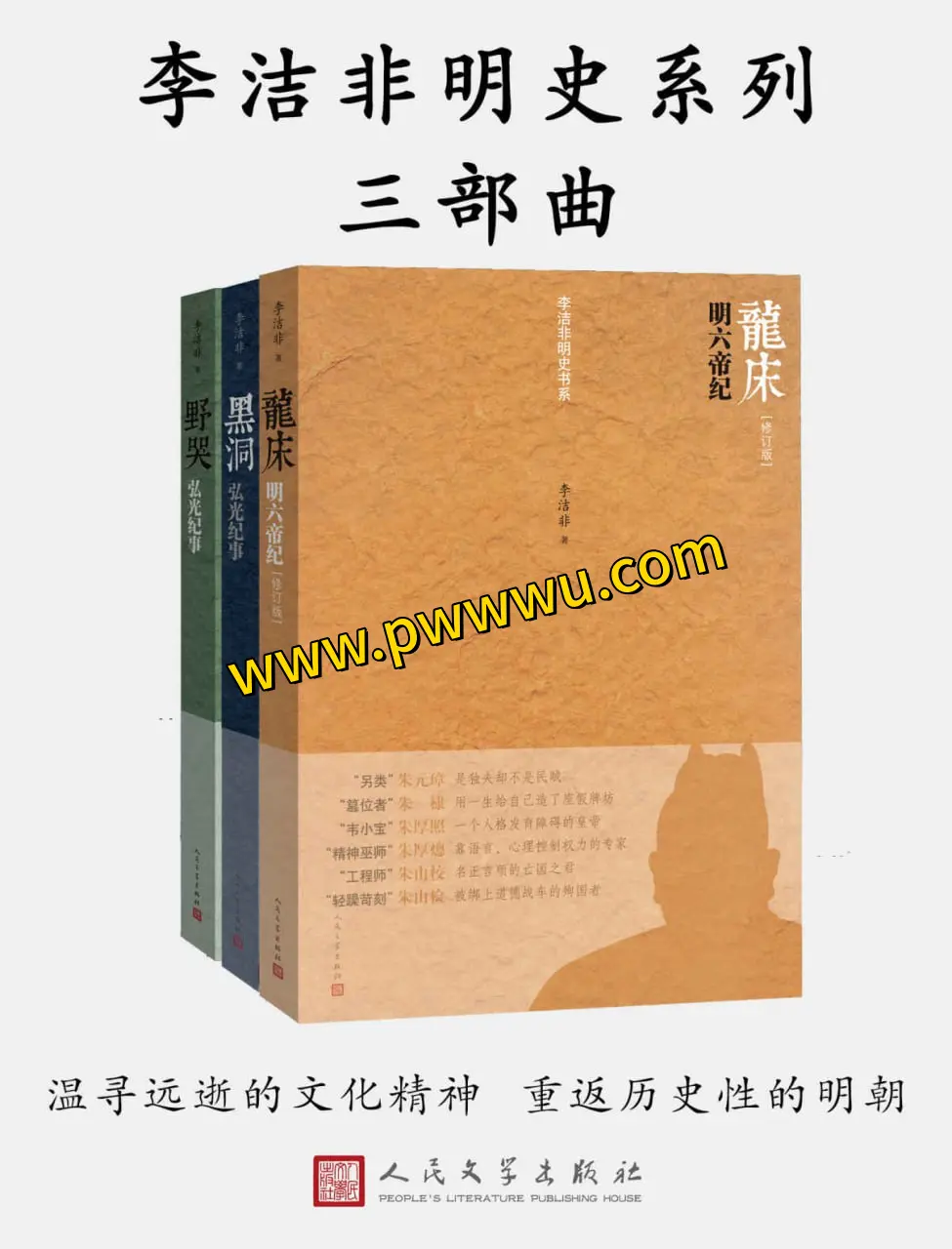 李洁非的明史系列三部曲深入探讨了明朝的历史。《龙床:明六帝纪》细致描绘了六位皇帝的统治,揭示了帝制的深层结构。《黑洞——弘光纪事》则记录了南明弘光朝短暂而动荡的一年。《野哭:弘光列传》通过描绘十多位来自不同社会阶层的人物,展现了弘光时期的混乱与苦难。这三部作品共同勾勒出了一个多维度的明朝历史画卷。