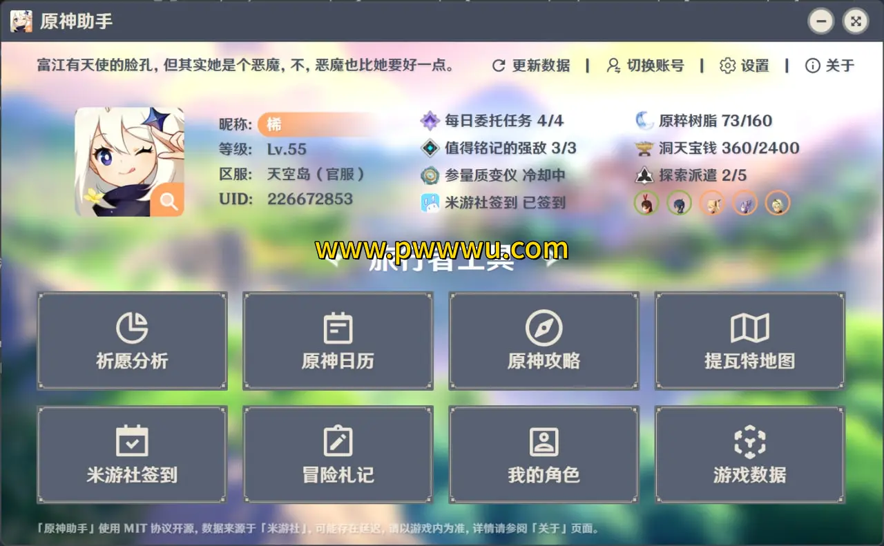 这款面向PC端的原神辅助工具,为玩家提供了多项实用功能。它能够协助完成日常签到、进行祈愿记录解析、查询便签状态,并展示详细的游戏数值面板。