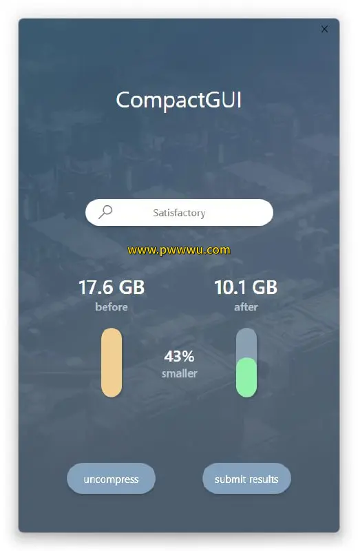 CompactGUI是一款基于Windows平台的开源文件压缩工具。该程序通过智能压缩算法帮助用户有效释放磁盘存储空间,操作界面简洁直观,只需定位目标程序目录并点击压缩按钮即可完成操作。