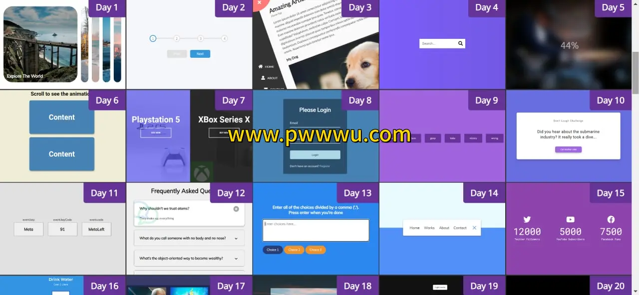 该资源库特别适合前端入门者进行系统性练习,通过模仿实现这些案例可以快速掌握现代网页开发的核心技巧。每个项目都聚焦特定技术要点,从基础布局到复杂动效均有涵盖,帮助学习者建立完整的前端知识体系。