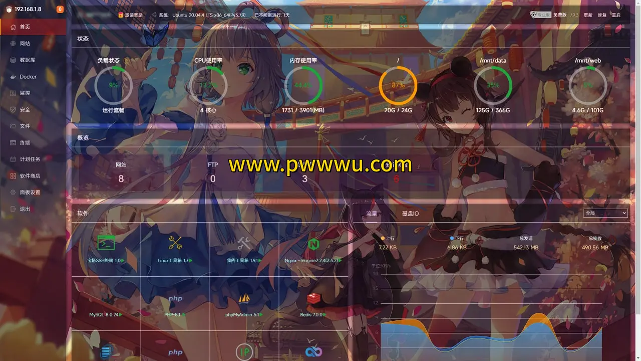 这款专为宝塔面板设计的主题采用了深受欢迎的二次元视觉风格,将虚拟歌姬洛天依的萌系元素与服务器管理界面完美融合。主题对面板的图标布局与色彩搭配进行了全面重构,既保留了原有功能的完整性,又为用户带来耳目一新的操作体验。