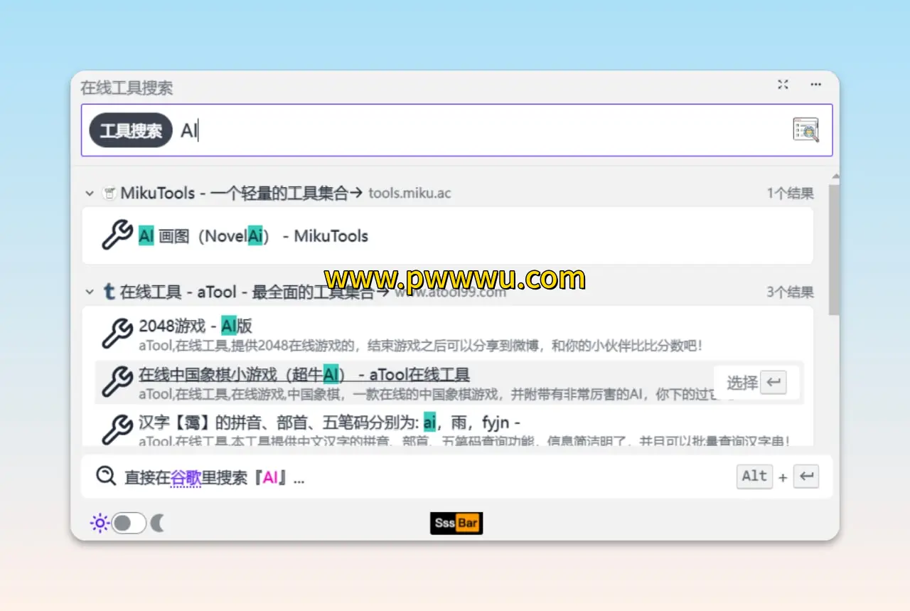 SssBar是一个整合多种实用工具的在线搜索网站,用户可通过统一入口快速调用各类网络应用。该平台将散落在不同网站的功能模块进行系统性整合,形成了便捷的一站式服务体验。