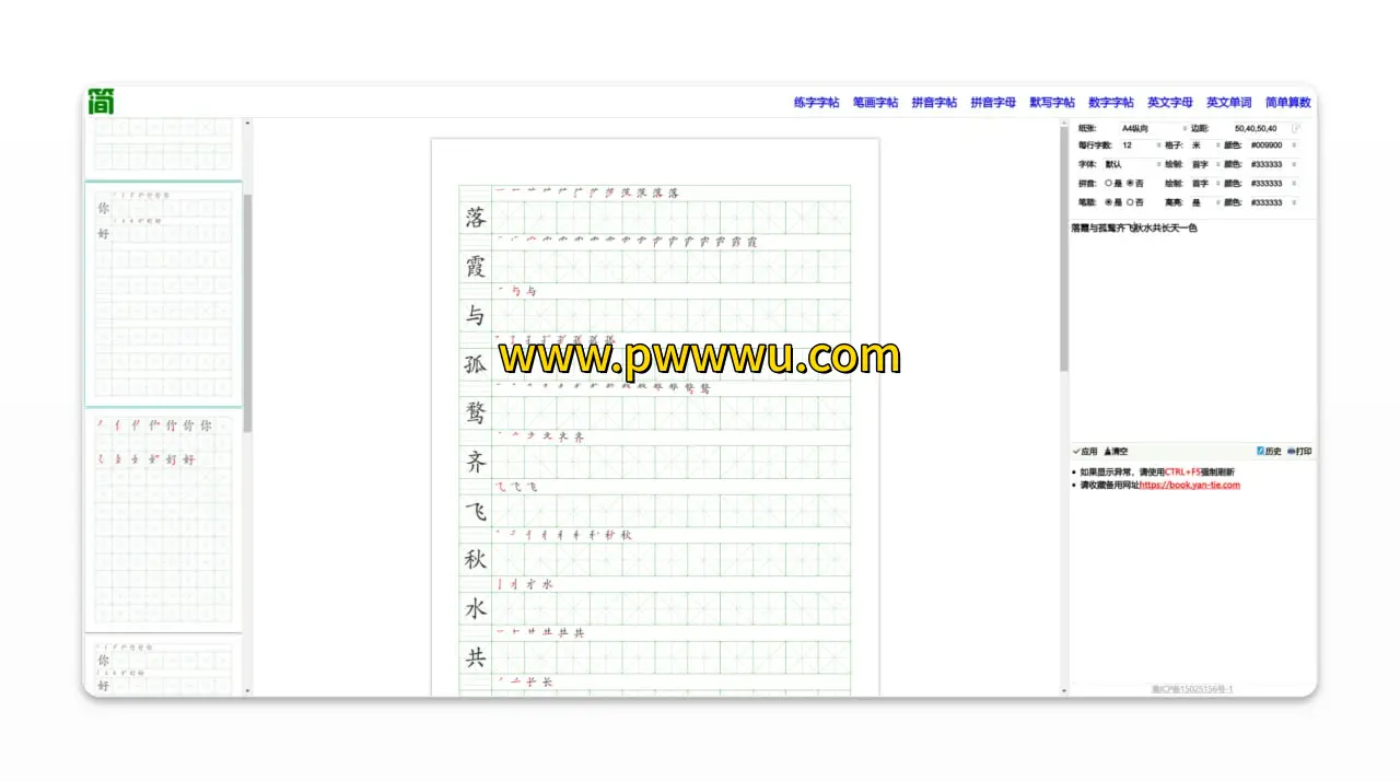 系统除提供标准汉字练习模板外,还包含数字书写、拼音认读、英文单词拼写及数学运算等专项字帖。用户可根据学习需求自由组合内容,灵活调整版式布局,生成个性化练习材料。通过自适应排版技术,字帖内容能自动匹配常见纸张规格,方便直接打印使用。