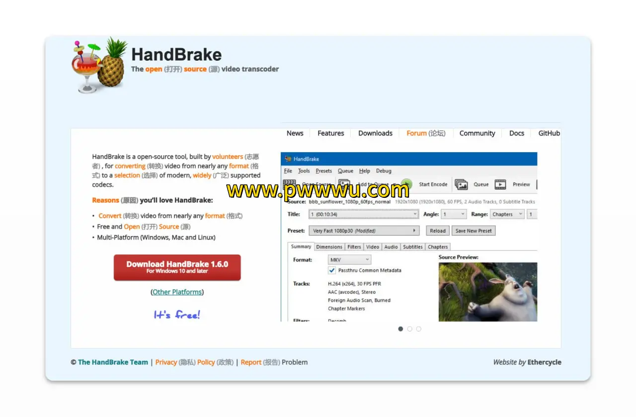 HandBrake是一款基于FFmpeg的视频处理工具,提供跨平台支持。