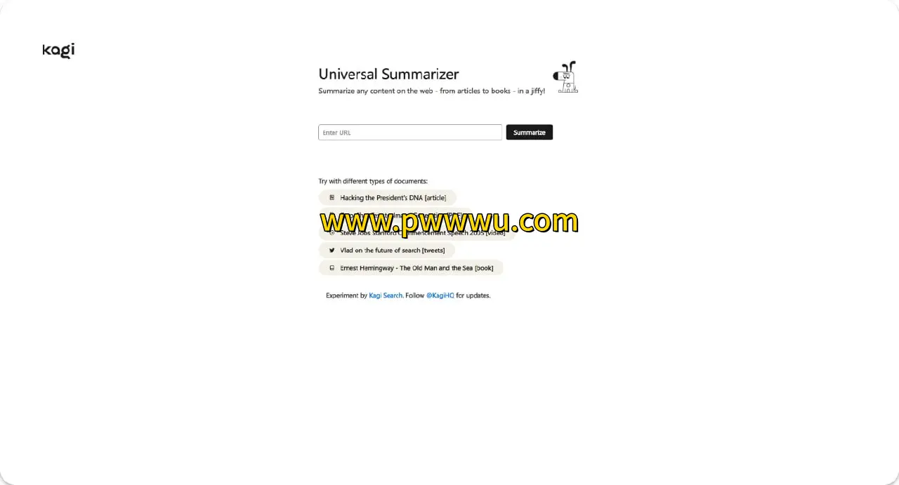Universal Summarizer:智能摘要工具 这是一款由付费搜索引擎Kagi开发的智能摘要工具,能够快速提炼网页内容的核心信息。 主要特色 支持通过输入网址直接获取内容摘要 自动生成关键要点列表 当前处于免费使用阶段 对中文内容的处理效果有待提升 分享地址: https://labs.kagi.com/ai/sum