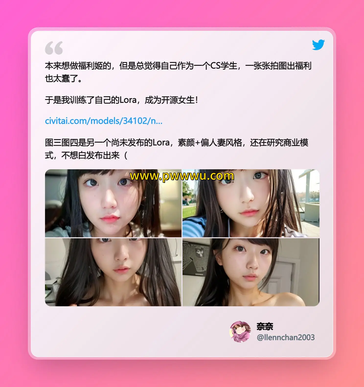 近期,一个名为奈奈Lora的模型引起了广泛关注,这是全球首个公开的女性角色开源模型。