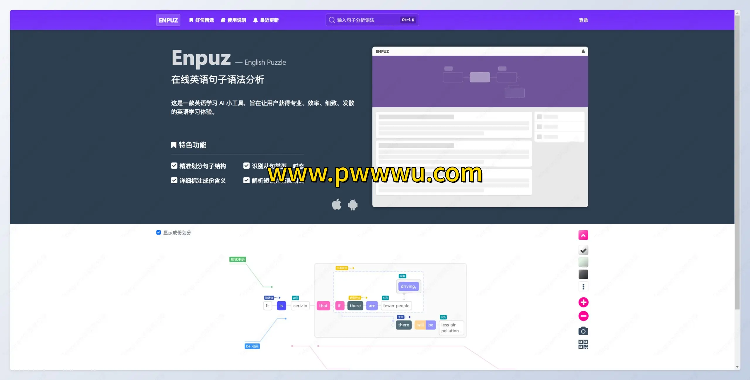 Enpuz是一款专注于英语语法解析的实用工具。它能对输入的英文句子进行细致的语法结构分析,特别适合希望深入理解语法规则的学习者使用。
