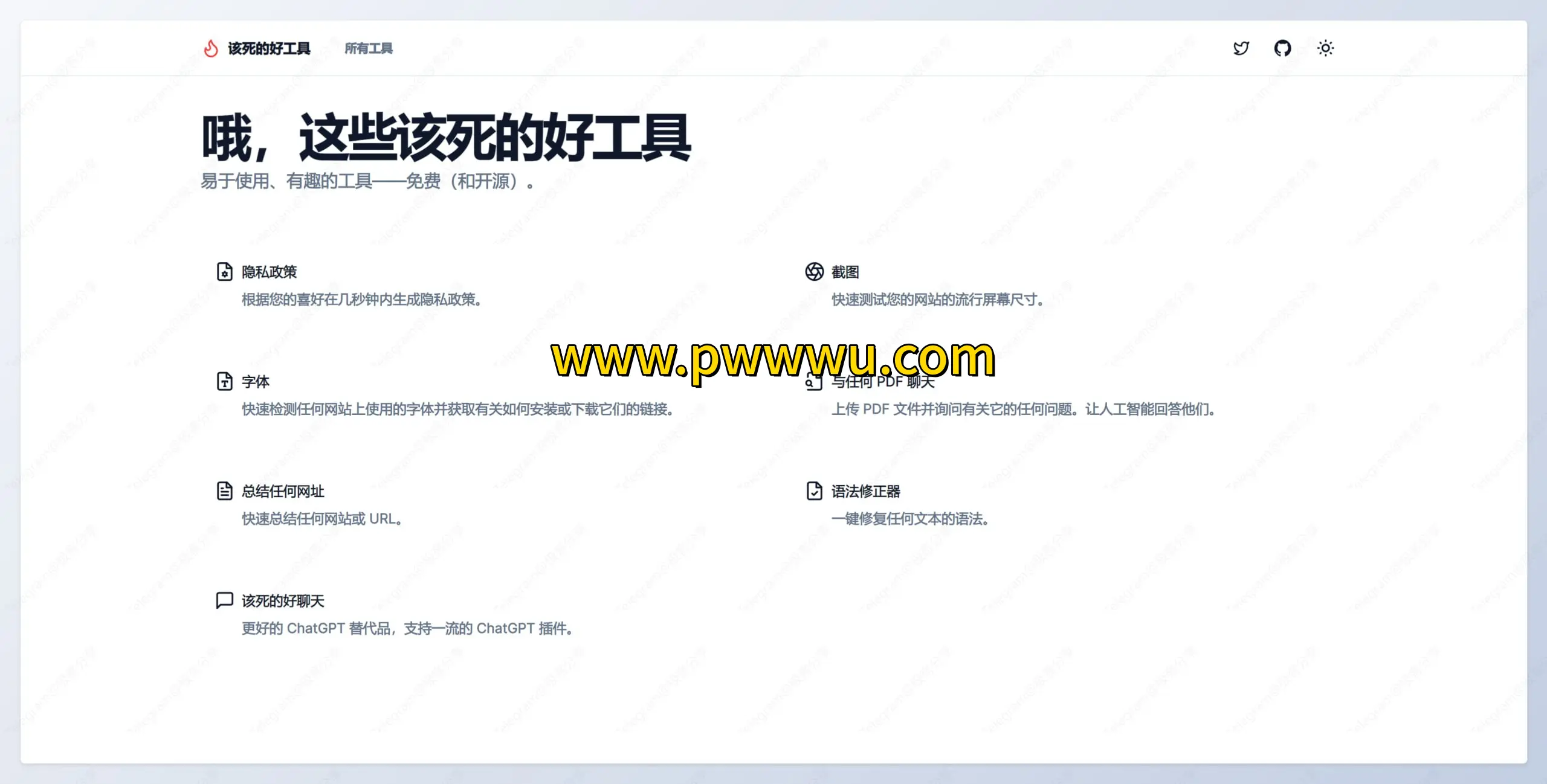 DamnGood作为开源实用工具集合平台,目前整合了七项核心功能模块。该平台包含隐私政策生成器、屏幕尺寸测量仪、网页字体识别系统、PDF智能对话、文本摘要工具以及智能交流助手等功能模块。