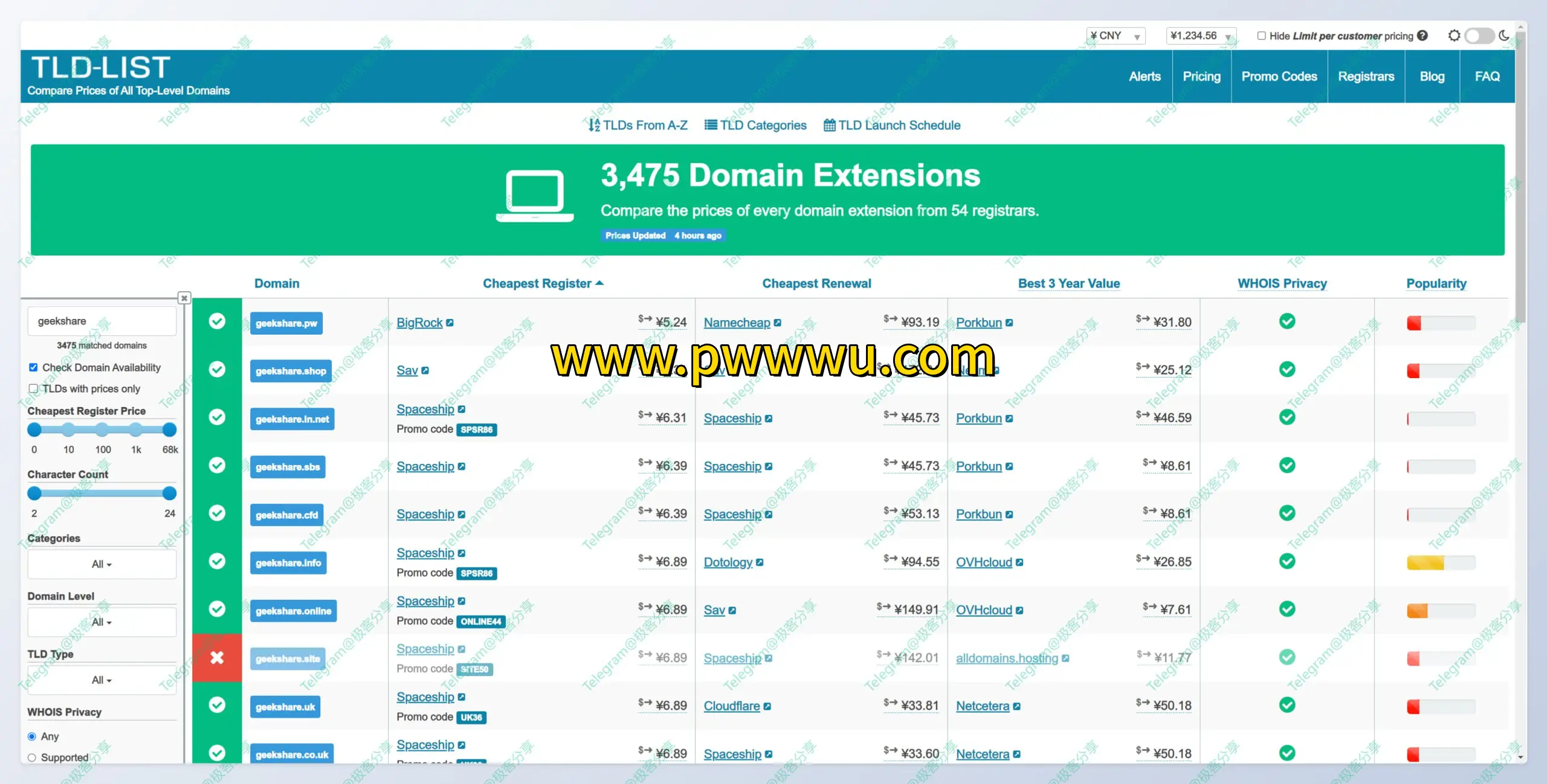 TLD LIST是一款专业的域名检索工具,能够帮助用户快速查询各类域名后缀的注册信息。该平台会实时展示不同注册商的最新价格,包括首年注册费用和续费成本,同时提供完整的Whois查询服务及域名热度分析数据。