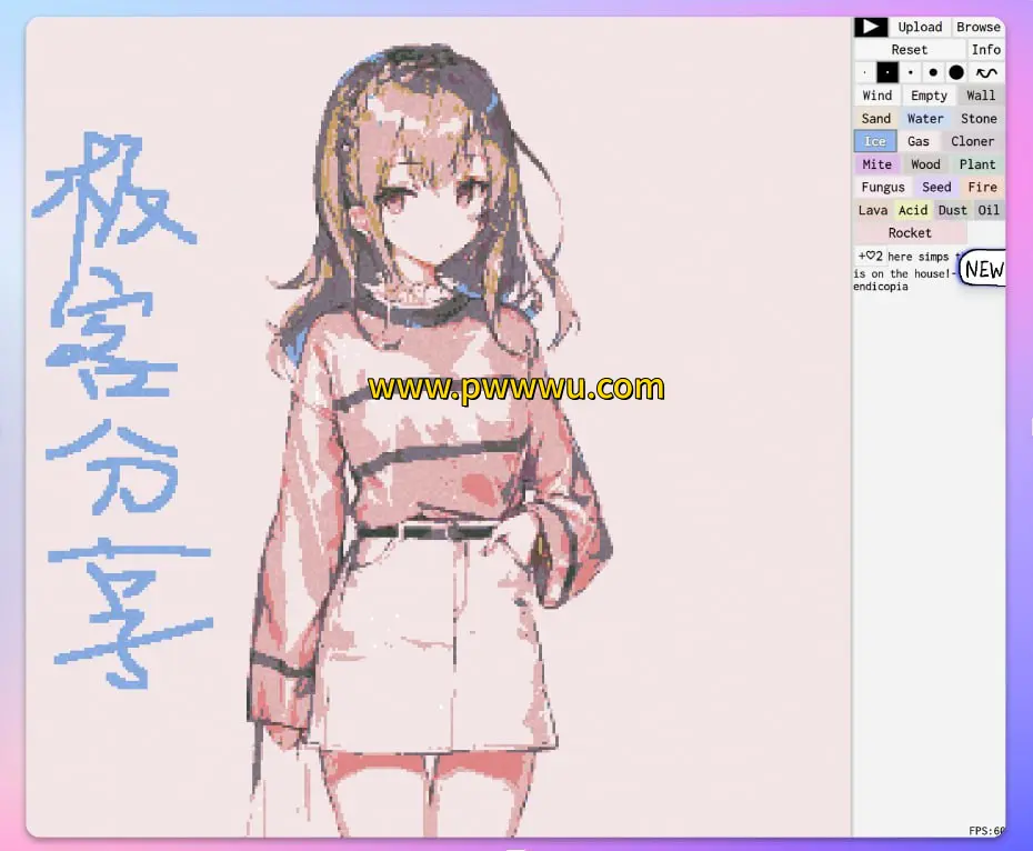 sandspiel是一款创意十足的在线沙盘模拟游戏。进入游戏后,您将看到包含多种物质类型的工具面板,建议初次体验时先了解各类元素的特性。