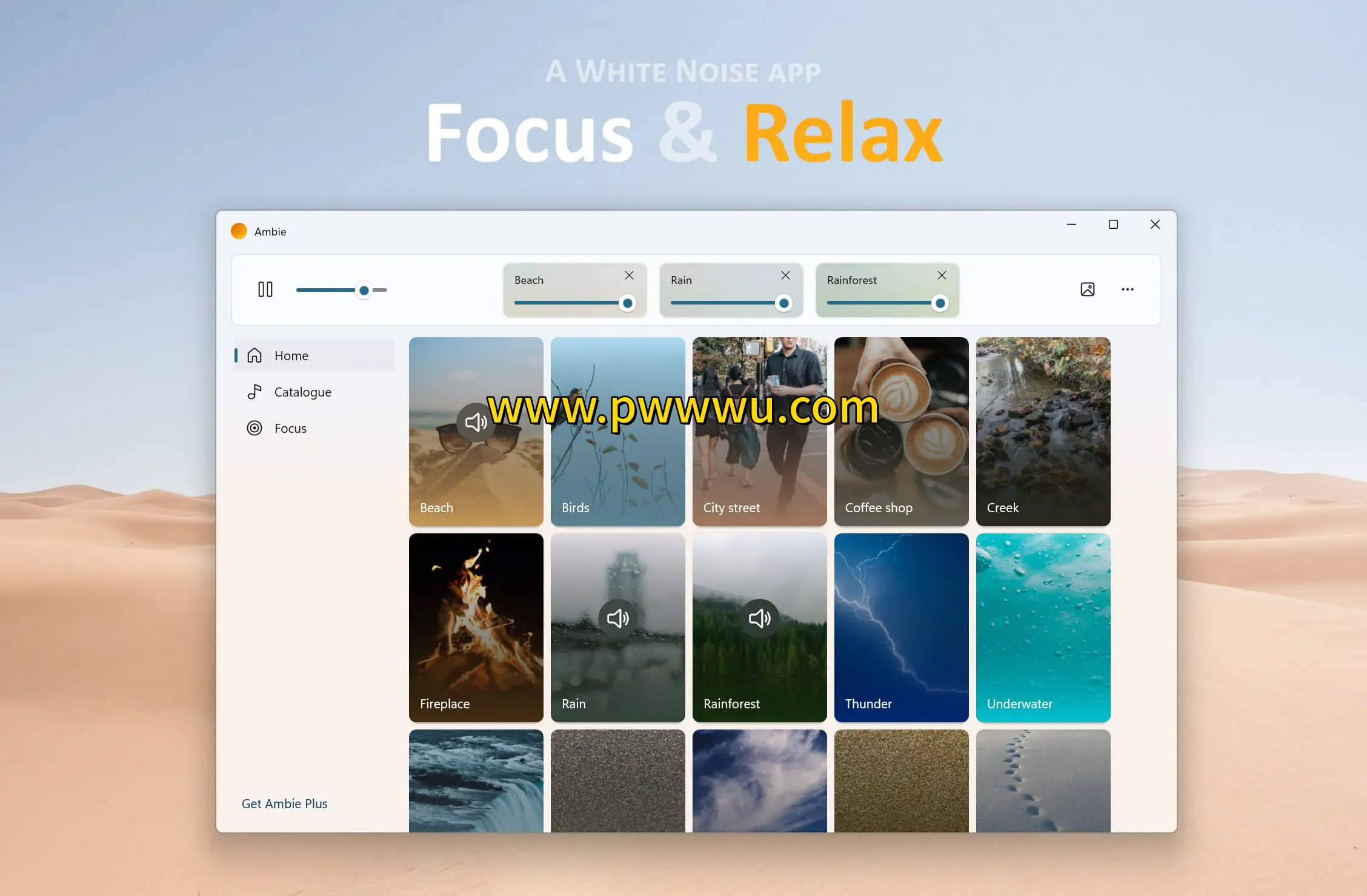 Ambie 是一款专为 Windows 平台设计的白噪音播放软件,能够提供多种自然音效与舒缓声音,协助用户提升注意力、改善睡眠质量或进行情绪放松。该程序全面支持中文界面,并内置了类似番茄工作法的专注计时工具,方便用户在工作和学习时更好地管理时间。
