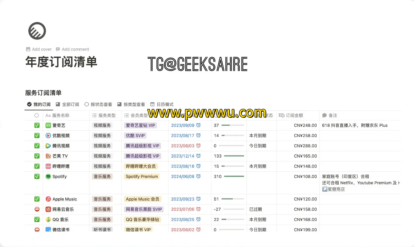 - 到期提醒:通过数据库的提醒设置,及时掌握续费或取消的截止时间。