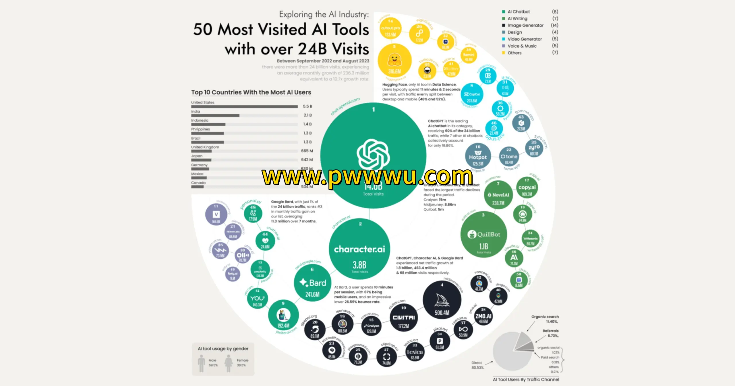 在2022年9月至2023年8月期间,全球最热门的50款智能应用累计获得超过240亿次访问,平均每月访问量达20亿人次。其中仅聊天机器人应用就贡献了146亿次访问,占总访问量的六成以上。