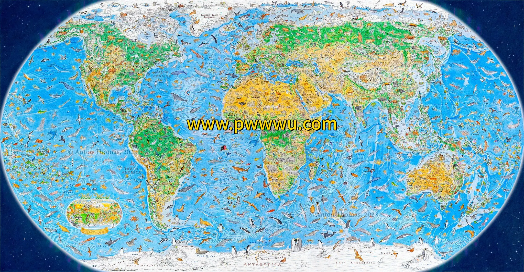 艺术家安东尼·托马斯历经三年精心创作,亲手绘制了一幅包含1642种动物的世界分布图。这幅地图展现了一个没有人类文明痕迹的自然世界,既看不到城市轮廓,也找不到国家边界,完全以野生动物和原始生态环境作为核心内容。