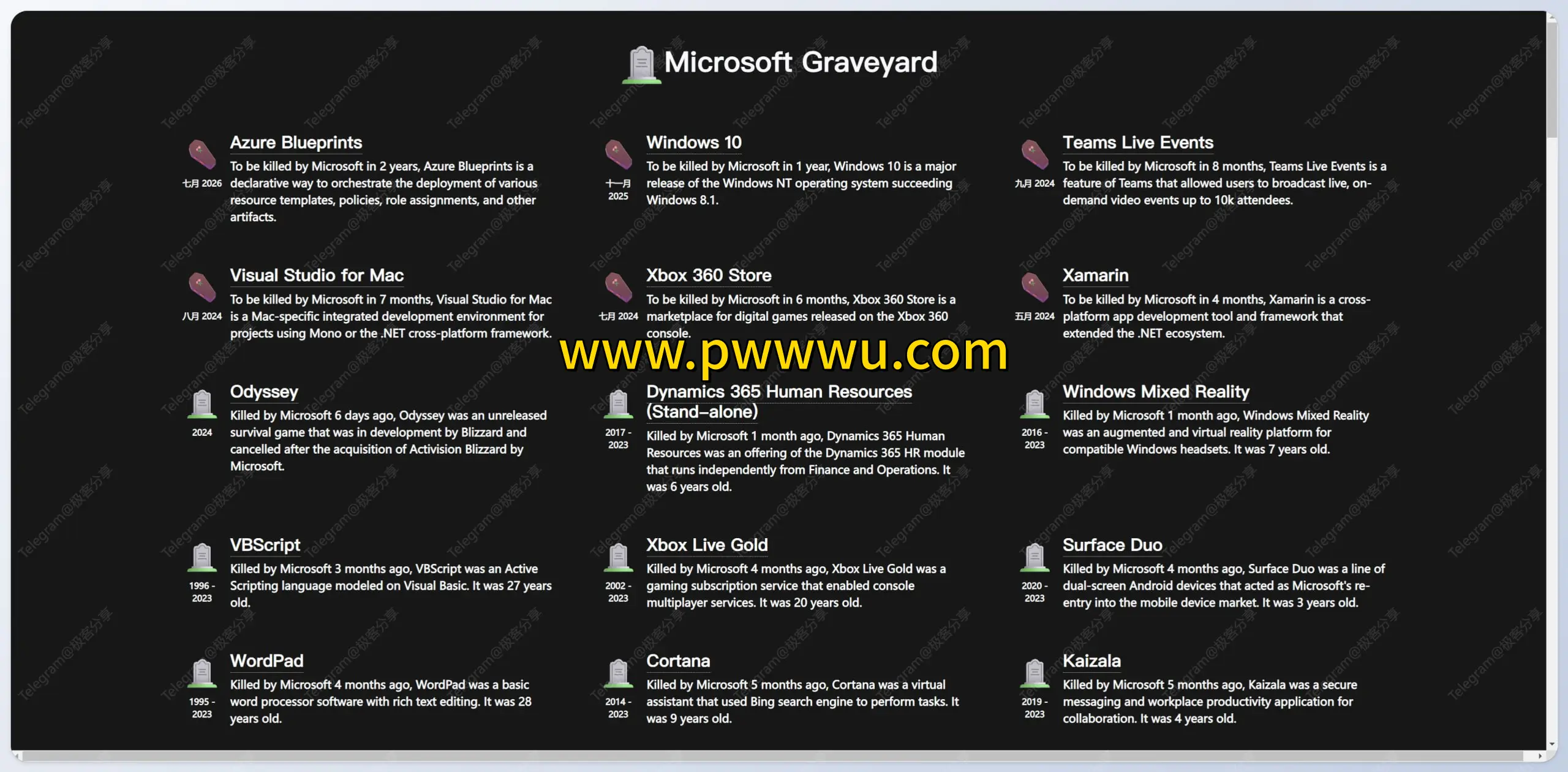 平台收录了多款广为人知的微软退役产品,例如智能助手Cortana、经典浏览器Internet Explorer、Windows 7操作系统以及移动设备平台Windows Phone等。这些产品均已在微软的战略调整中停止更新或服务。