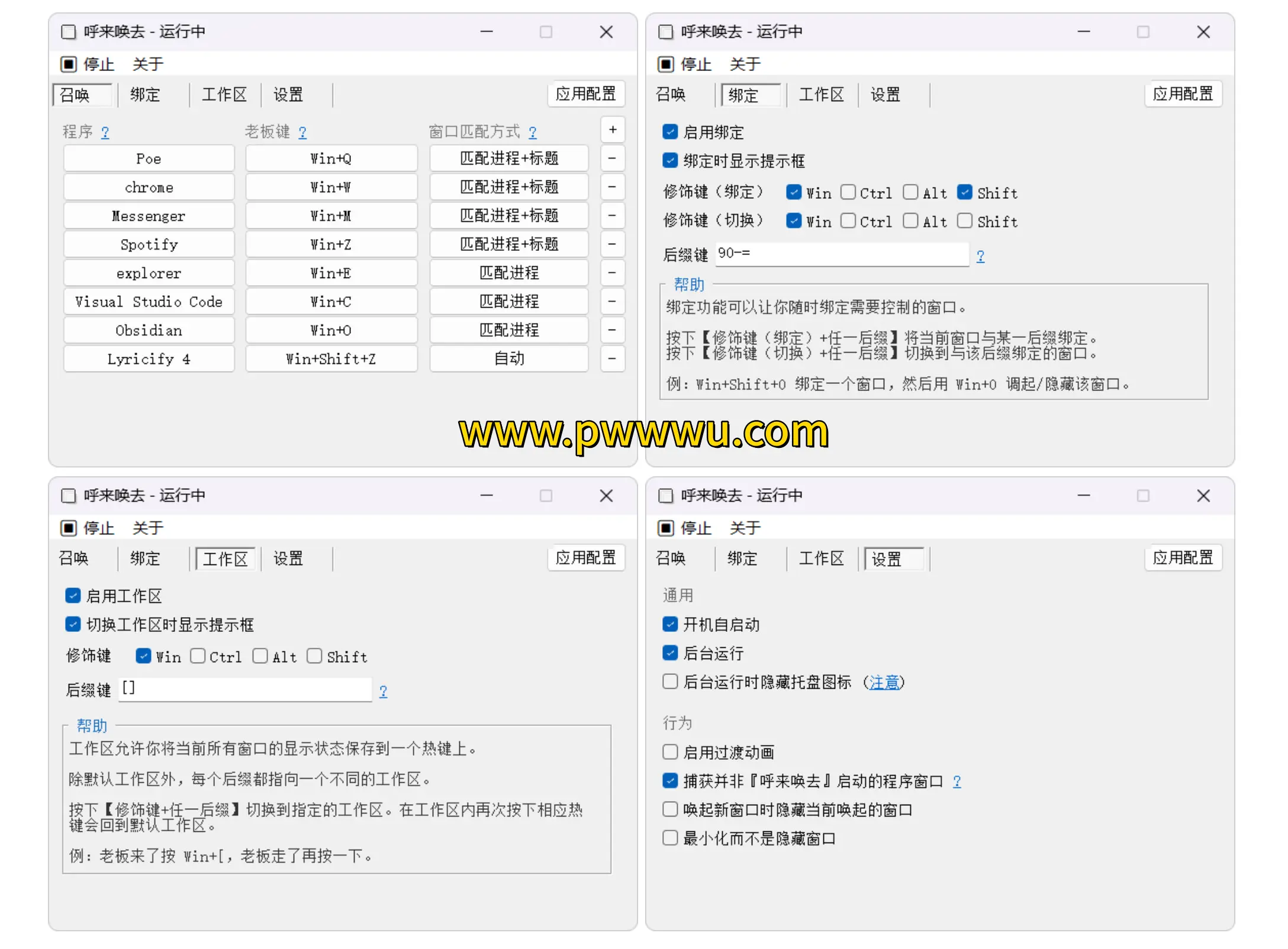 该工具具备多项实用功能:支持为任意程序设置个性化快捷键;可为当前活动窗口绑定专属热键;提供工作区保存功能,能够记录窗口的显示状态和布局。这些特性使其成为提升工作效率的得力助手,特别适合需要快速切换工作场景的用户。