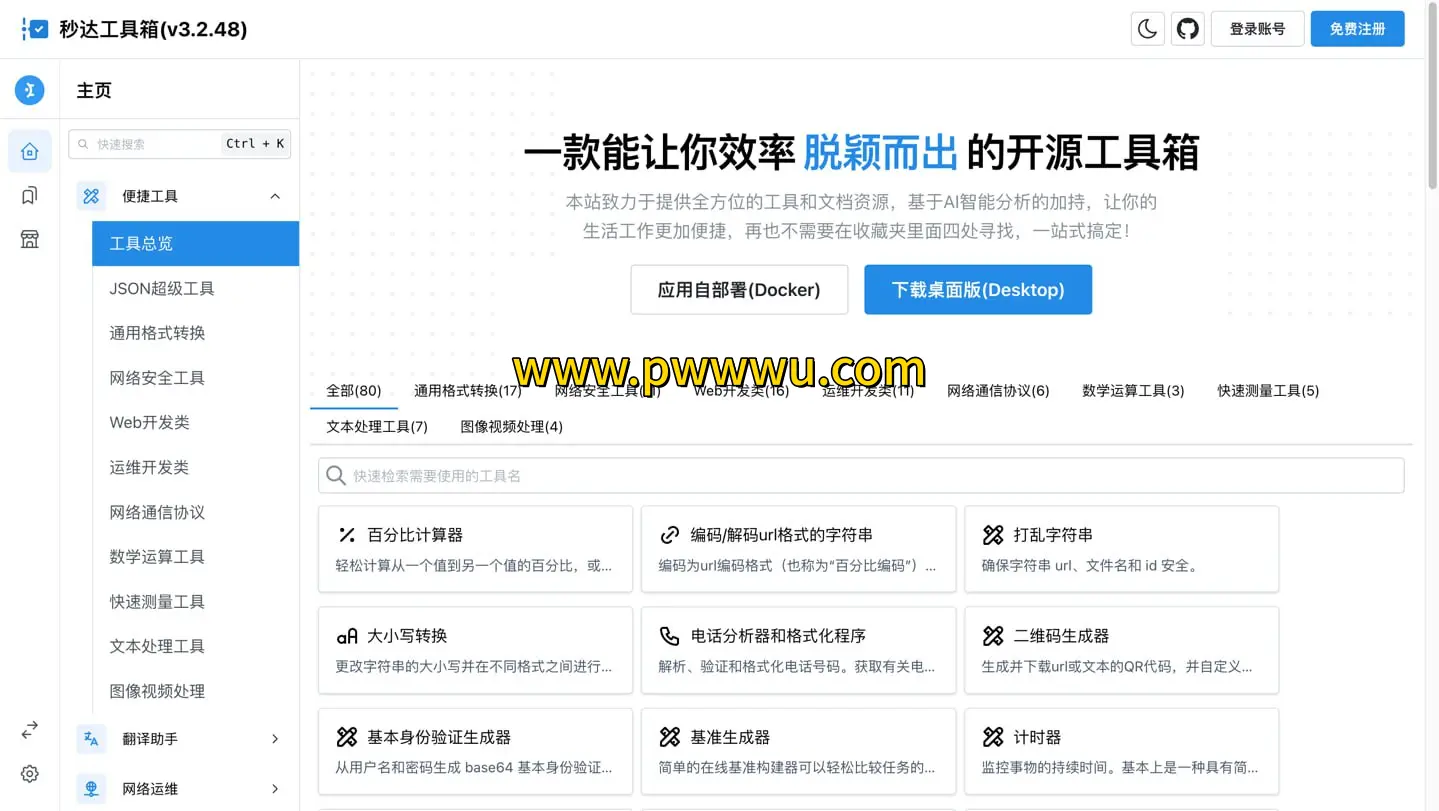 秒达工具箱是一款开源的一键式快捷工具集,基于IT Tools项目开发而成。它在保留原有功能框架的基础上,对内置模块进行了全面汉化处理,同时补充了多个实用小工具,方便用户快速调用。