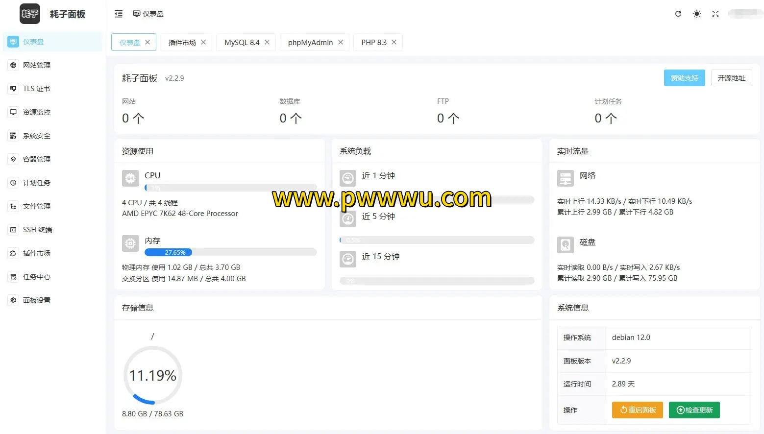 耗子面板是一款基于Linux系统的轻量化服务器管理工具。作为开源解决方案,该面板在设计上注重资源效率,实测在Debian 12系统环境中部署完整面板及LNMP运行环境后,内存占用控制在500MB以内。相比采用容器化技术的同类产品,在资源消耗方面表现更为出色。