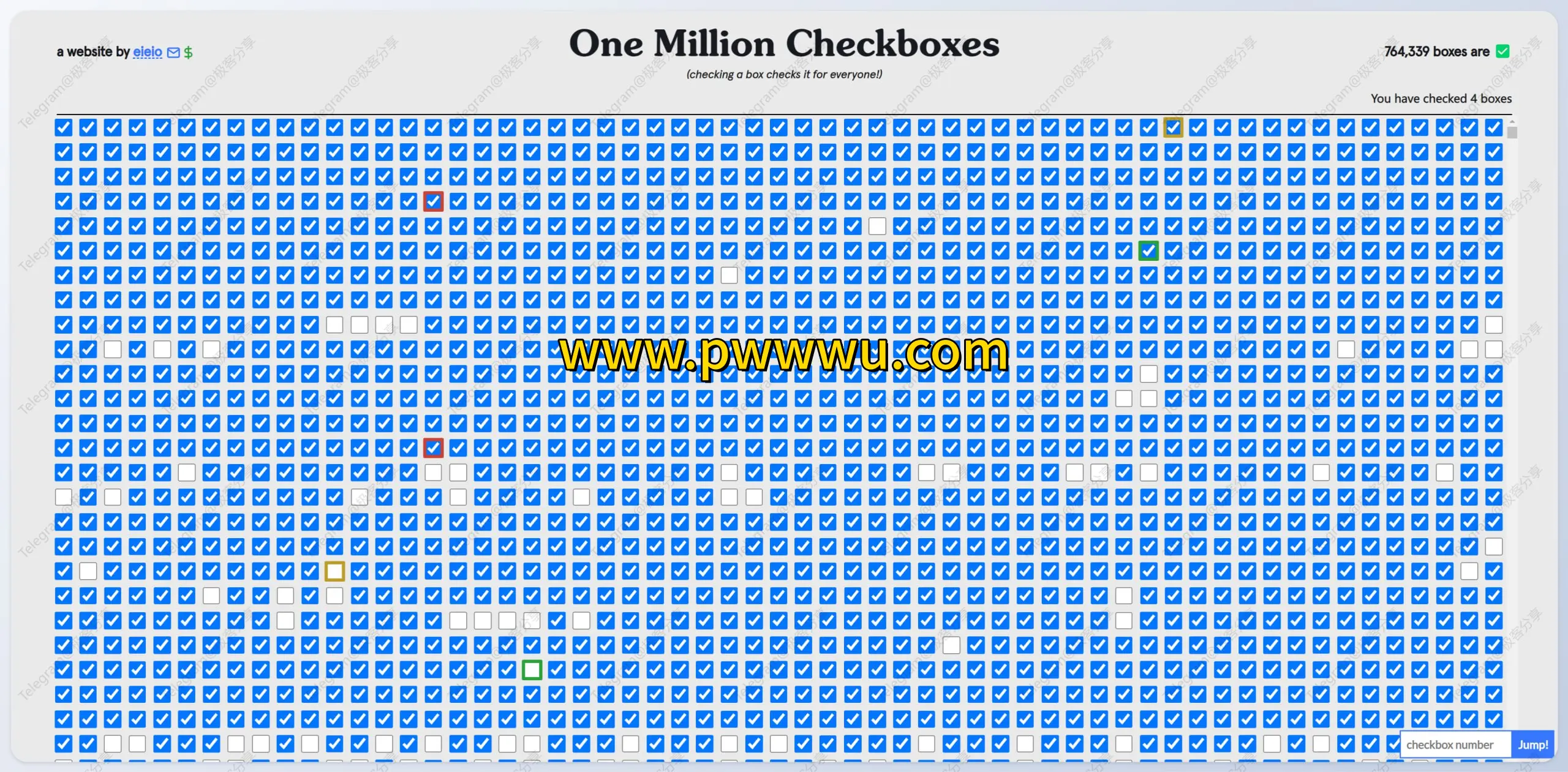 这个特色网站允许全球用户实时协作操作复选框。当访问者进入页面时,可以看到来自世界各地的参与者正在同步进行勾选或取消操作,最终目标是将所有复选框变为选中状态。