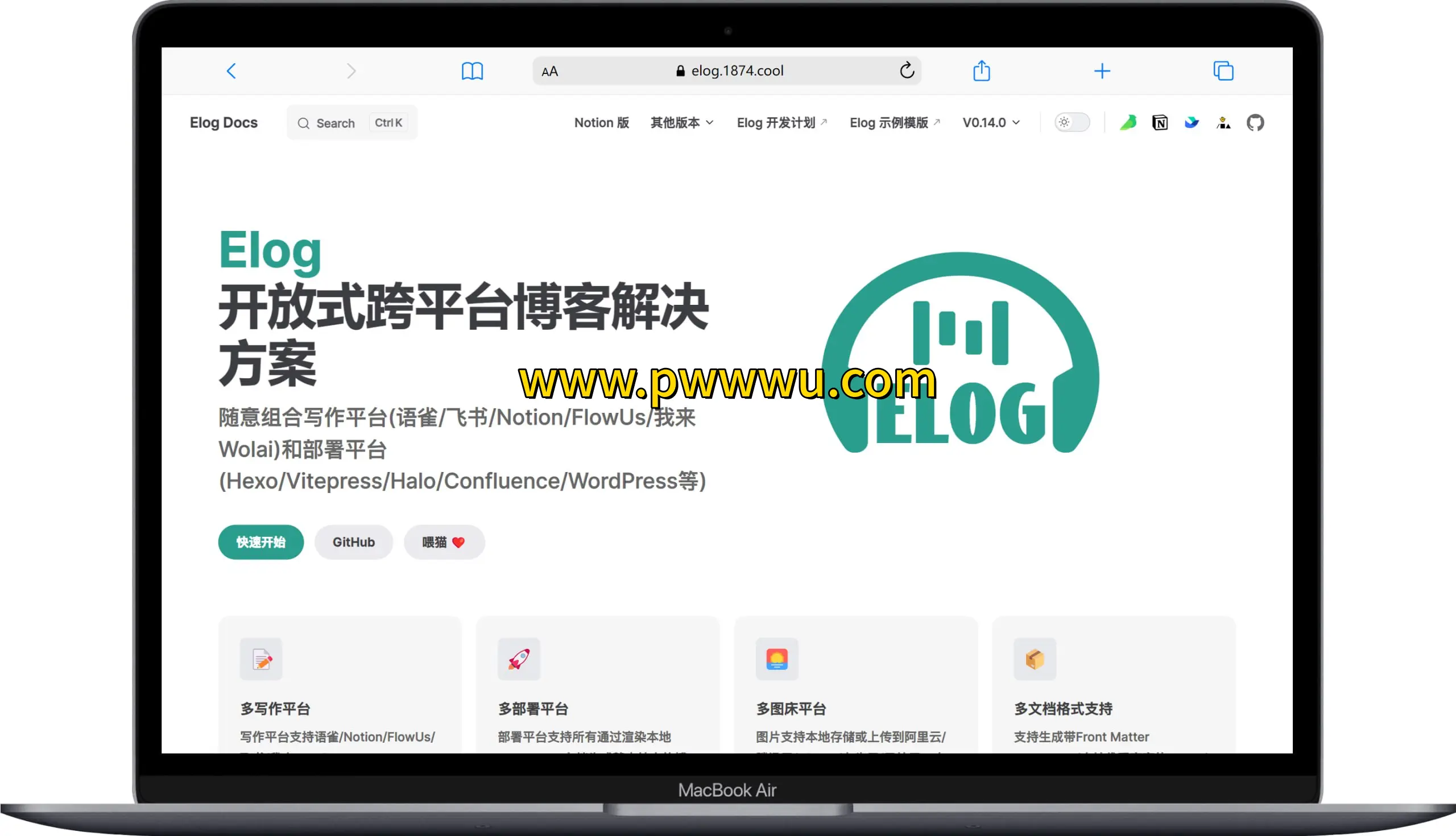Elog是一款面向多平台的内容发布工具,其设计理念聚焦于简化写作与部署流程。该方案允许用户自由搭配不同的创作平台与博客框架,例如Notion、语雀、FlowUs、飞书等写作平台,以及Hexo、Vitepress、HuGo等博客生成器。