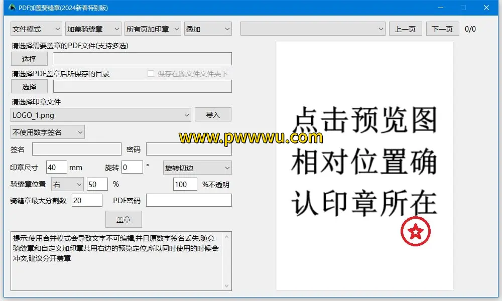 这款 PDF 骑缝章处理工具支持导入完整印章图像,并依据文档页数实现智能分割。用户可灵活调整印章尺寸与摆放位置,满足个性化需求。