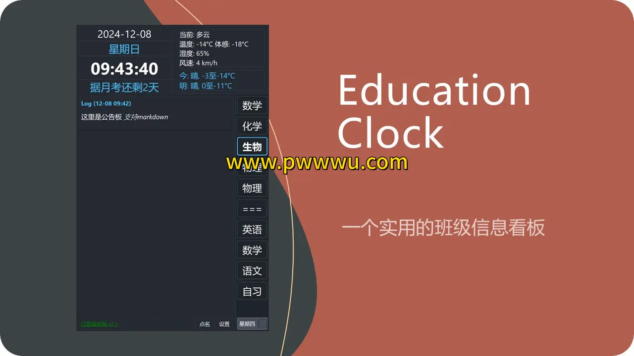 Education-Clock是一款专为校园场景设计的桌面时钟工具,集成了课程管理、环境信息查询与实用工具等多样化功能。该软件通过模块化设计实现了课程表同步、实时天气监测、定时任务管理等服务,能够有效提升学习场景下的时间管理效率。