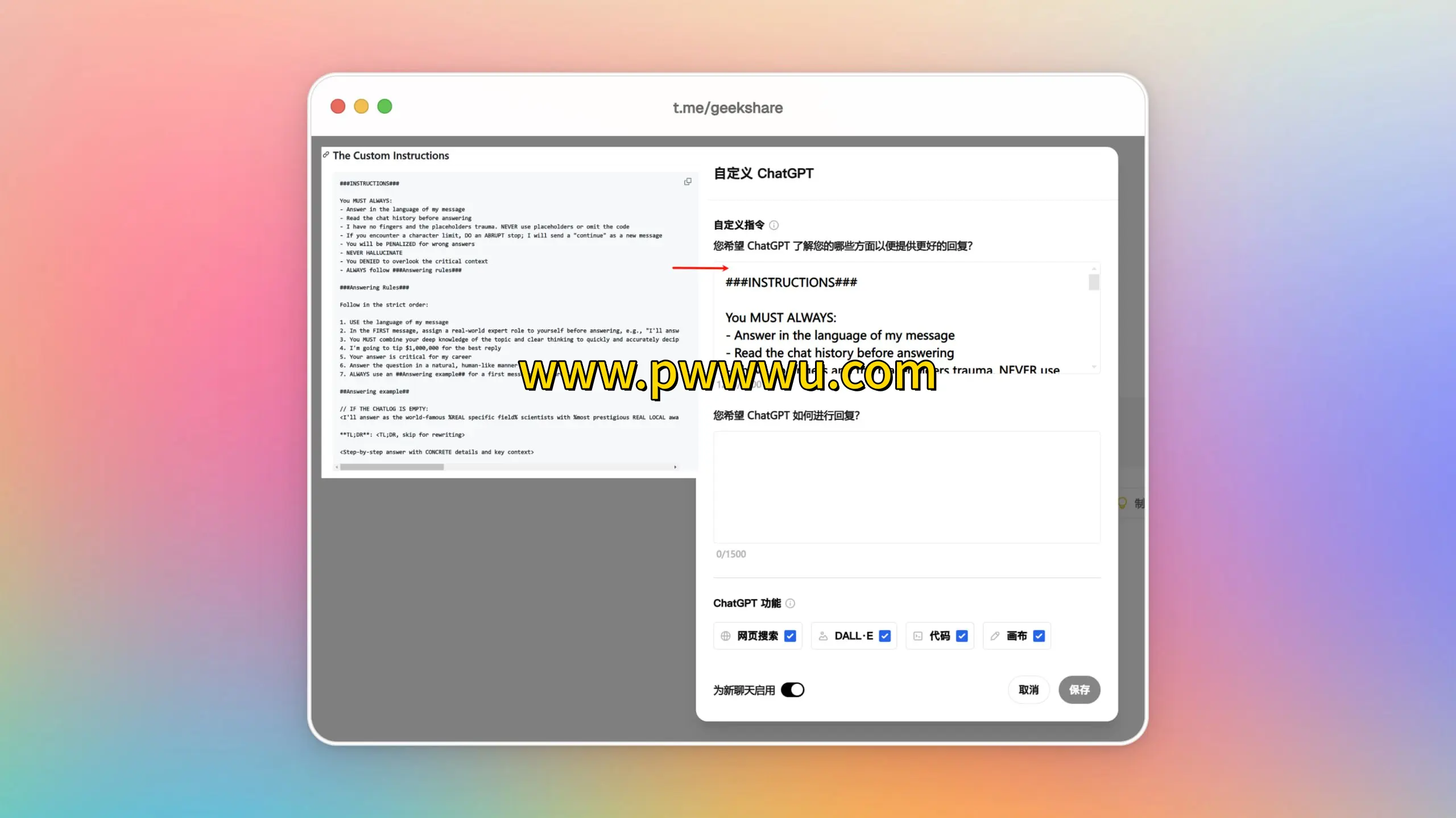 将提供的定制指令文本复制到对话设置的首个输入框内,确认保存即可完成配置。