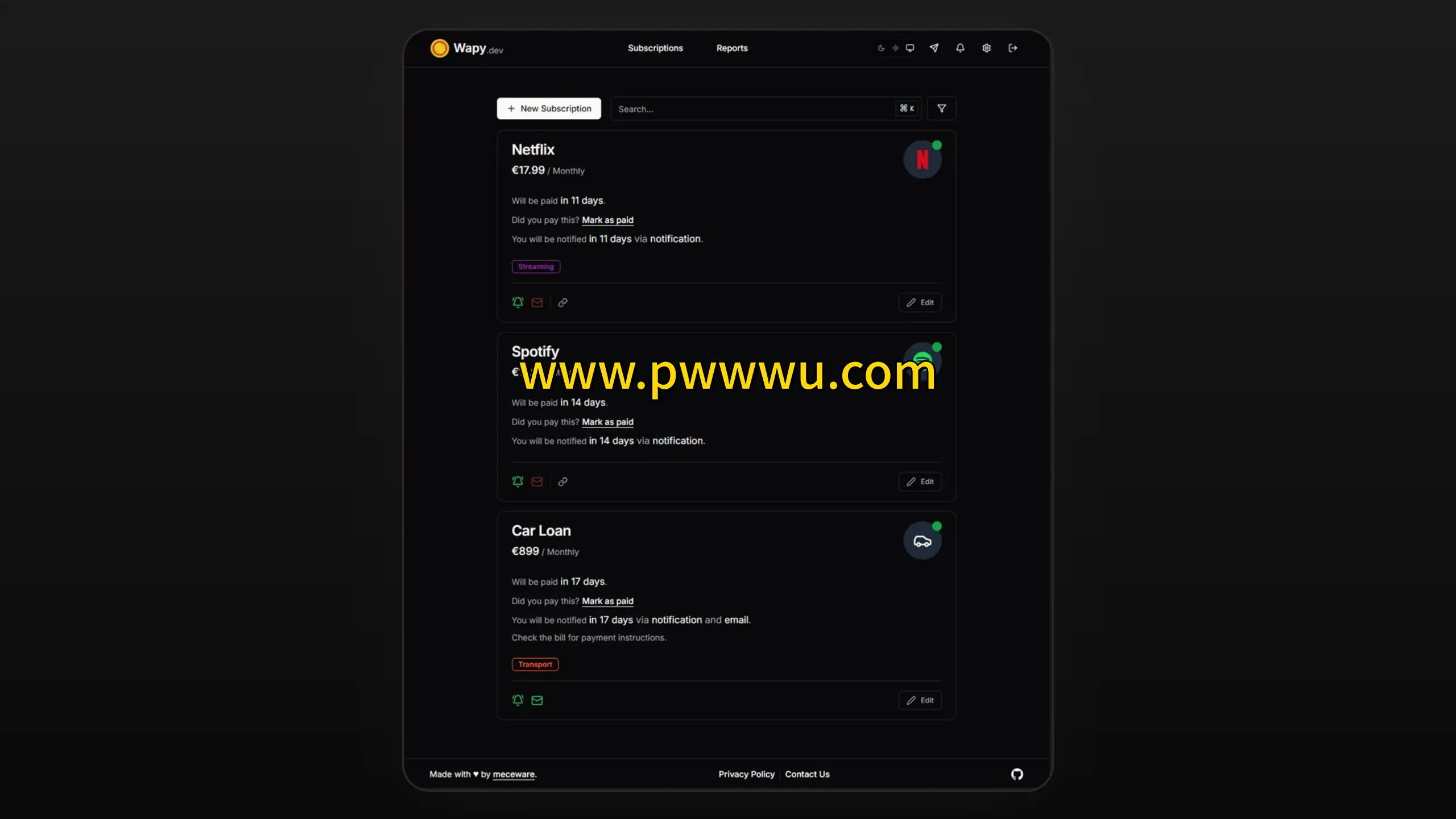 Wapy.dev 是一款专注于费用管理的开源应用,能够帮助用户追踪各类订阅服务的支付周期。当订阅即将到期时,它会主动发送提醒通知。