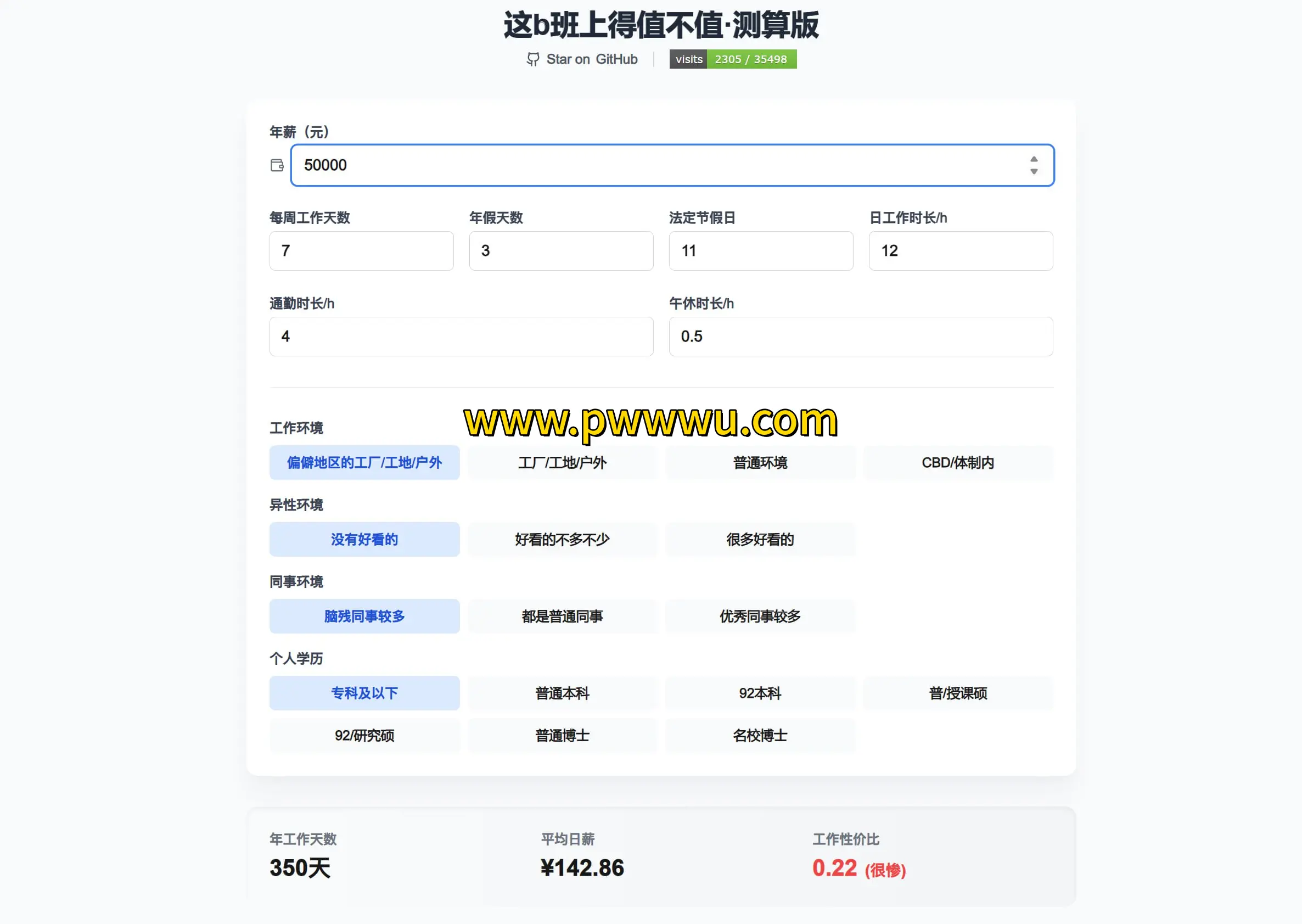 一款帮助你评估当前工作是否值得继续的在线工具,通过输入年薪和实际工作天数,计算出真实的日薪水平,并结合时间投入、办公环境等多方面因素,提供直观的参考数据。