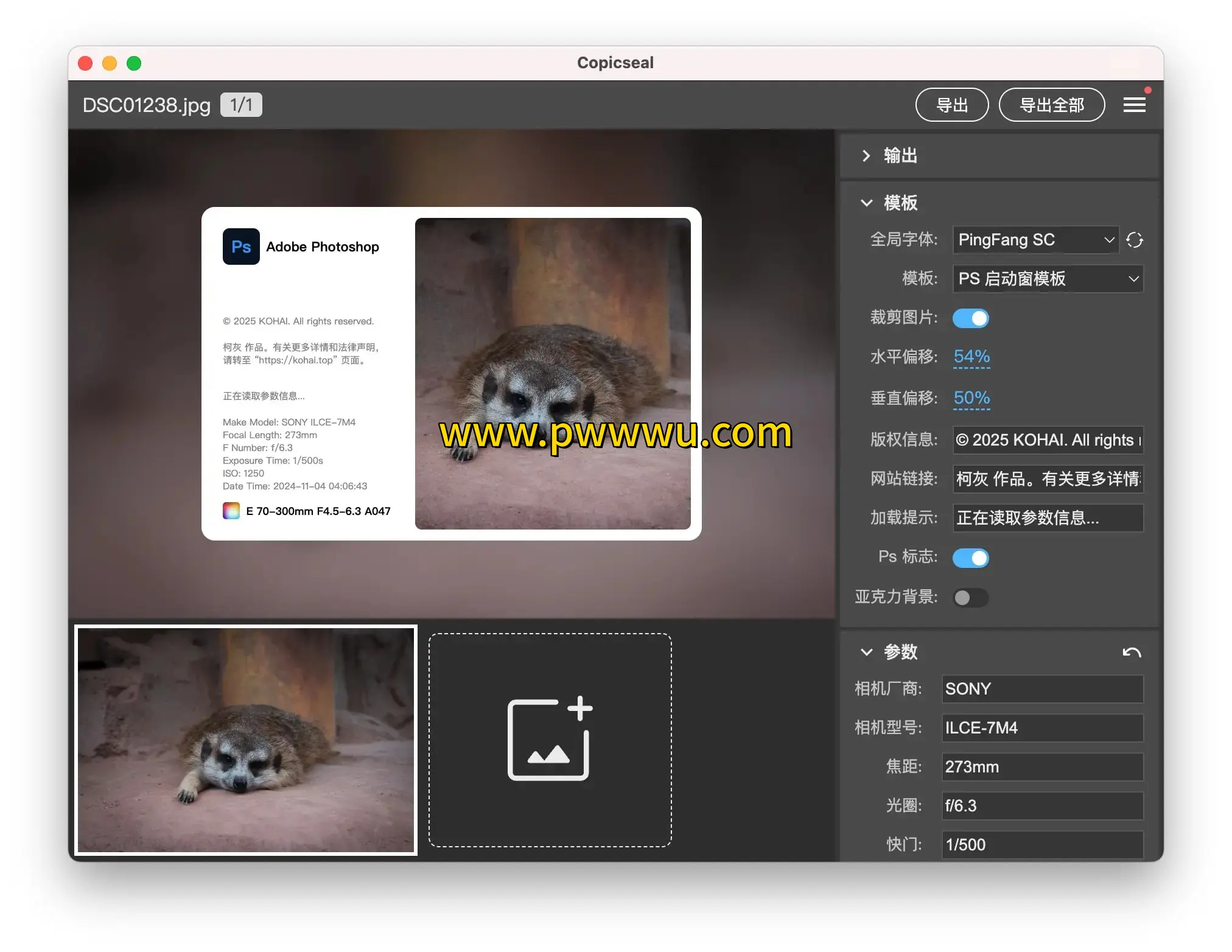 Copicseal是一款适用于Windows和macOS系统的图像处理工具,能够为摄影作品批量添加相框与水印效果。该工具支持自动读取照片的EXIF参数数据,并提供实时效果预览界面,帮助用户快速完成图片后期处理。
