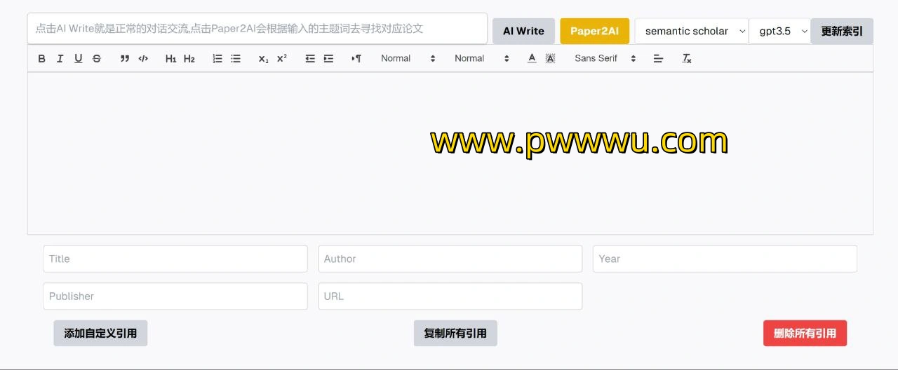 - 文献检索功能:点击“查找文献”,输入关键词即可在Semantic Scholar、arxiv或PubMed等数据库中搜索相关论文。系统会自动整理并整合这些信息到您的论文中