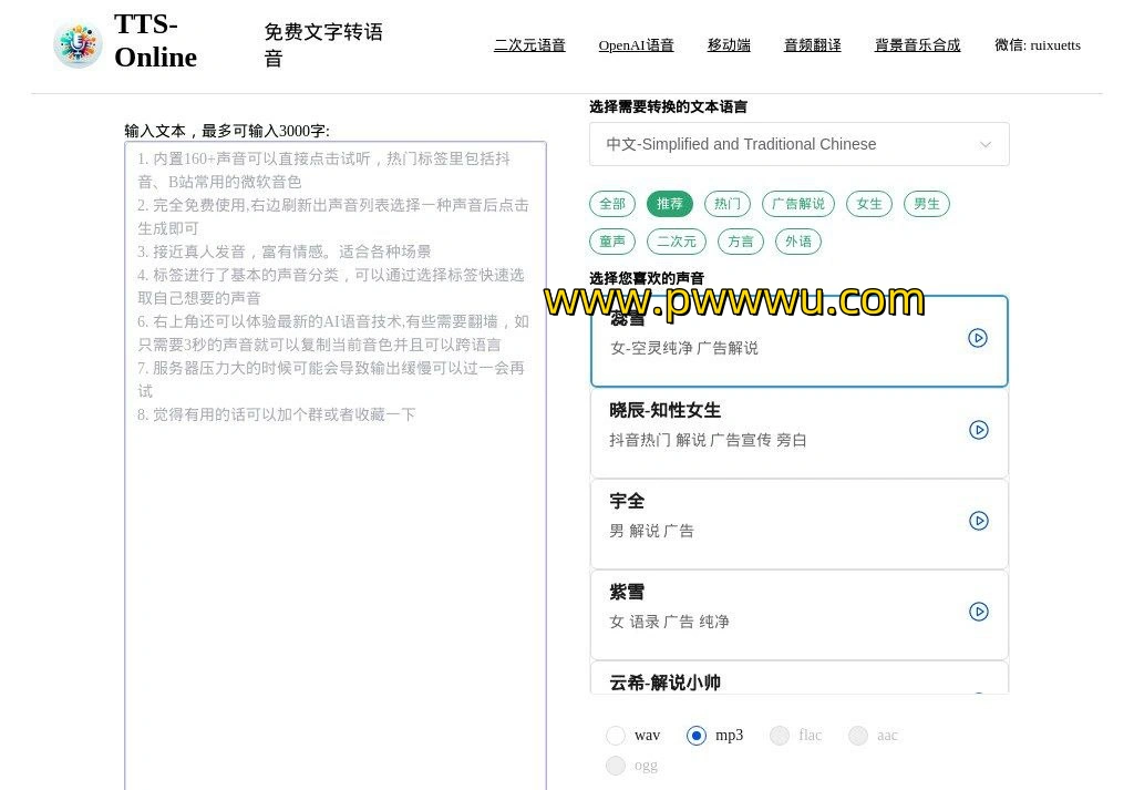 这是一个便捷的文本转语音平台,能够将文字内容转换成语音播放。工具完全免费,提供多语言支持,如英语、法语、德语、中文、日语和韩语等,同时涵盖多种不同的声音风格。